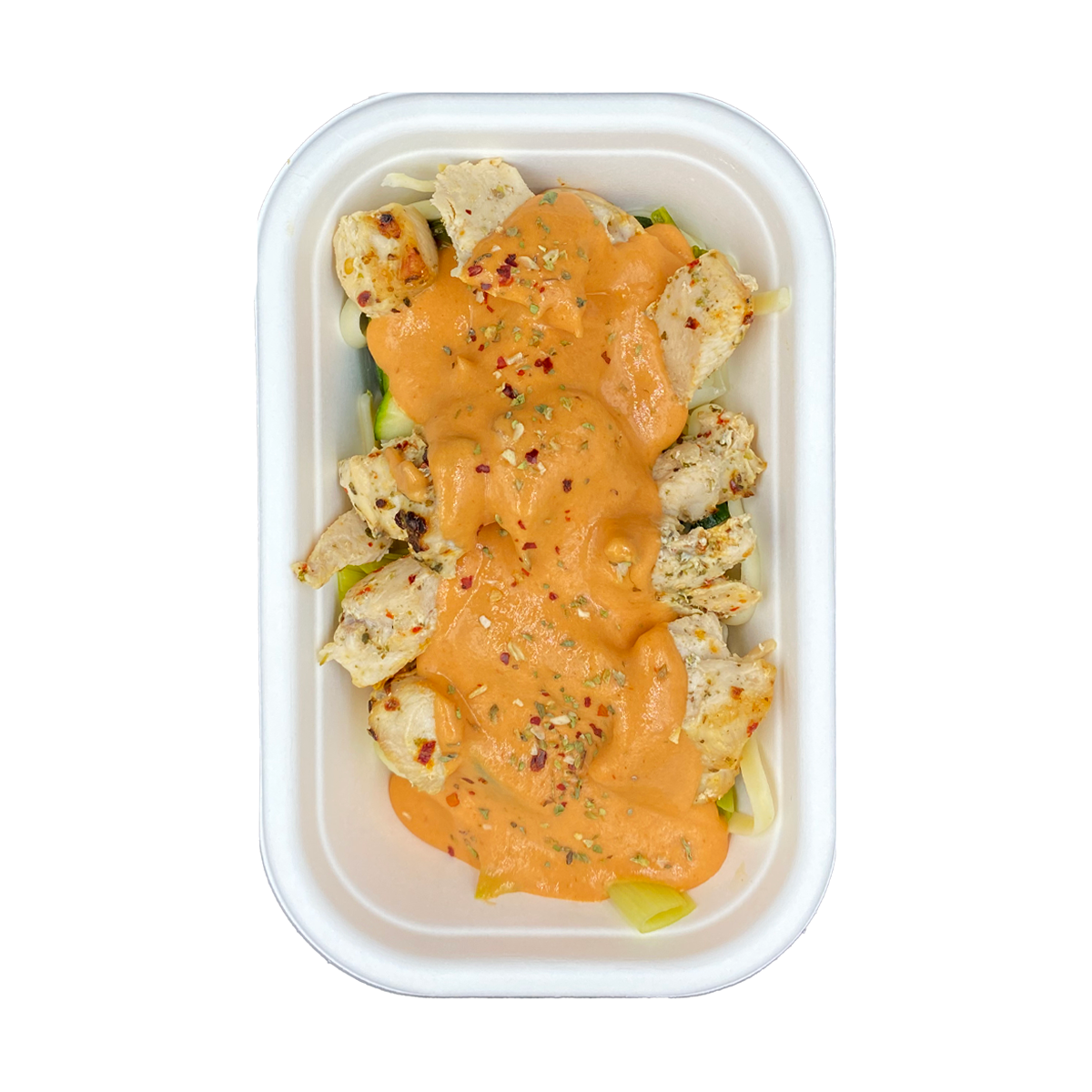 Ingrediënten: Kipfilet (150 g) 33,3%, Gekookte pasta (120 g) 26,7%, Prei (50 g) 11,1%, Courgette (50 g) 11,1%, Saus (80 ml: 55 ml Frito + 25 ml kookroom) 17,8%, Olijfolie (5 ml) 1,1%, Knoflook (vers geperst) (3 g) 0,7%, Italiaanse kruiden (1 g) 0,2%, Chiliflakes* (1 g) 0,2%